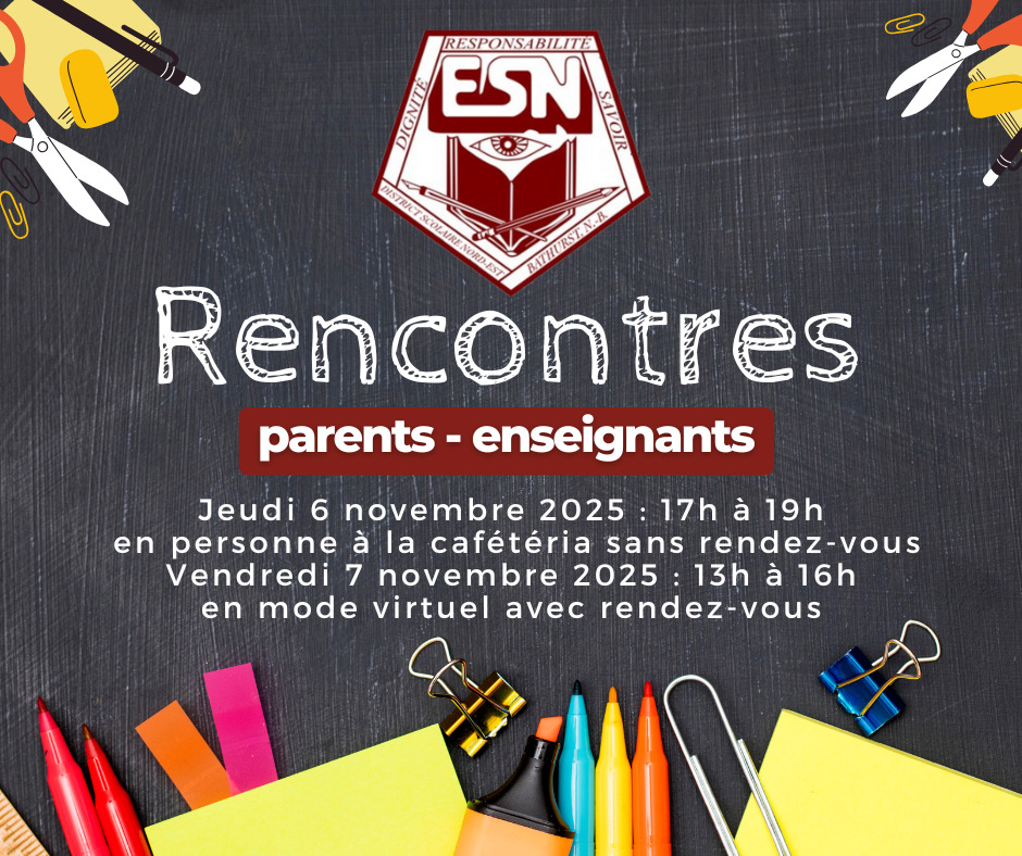 Chers parents et tuteurs, Pour votre information, les rencontres parents/tuteurs et enseignants se feront en deux temps. En premier lieu, les rencontres se feront le jeudi 6 novembre 2025 de 17h00 à 19h00 en présentiel à la cafétéria de l’ESN. Une deuxième rencontre aura lieu le